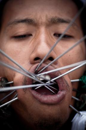 Probably the most bizarre aspect of the festival is the ceremonies which are held to invoke the gods. These include, "firewalking, body piercing and other acts of self mortification undertaken by participants acting as mediums of the gods... Men and women puncture their cheeks with various items including knives, skewers and other household items. It is believed that the Chinese gods will protect such persons from harm, and little blood or scarring results from such mutilation acts."
